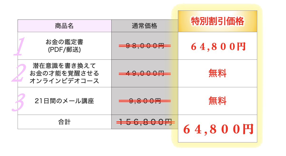 今後は、このオンライン講座は、定価49,800円(税込)で販売予定です。今回は、桜井先生の「お金の鑑定」に参加された方だけに、この講座をいち早く、しかも無料でゲット出来る大胆なプレゼントをご用意しました。ぜひ、この機会をお見逃さないようになさってくださいね^^
