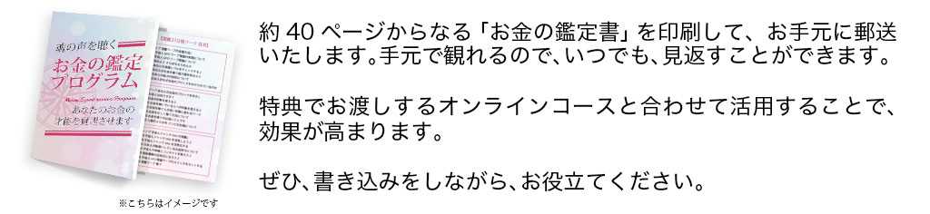 「お金の鑑定書」があなたの「お金の魂の声」を聴き・使命、天命を知る。豊かになるための適職を知る、どのように活動していくのか?という「自分自身を深く理解する」位置づけです。そして、オンライン講座は、自分を深く理解した上で、より速く、より効率的に、より効果的に、あなたの「お金の才能を覚醒させる」ための「実践編」です。