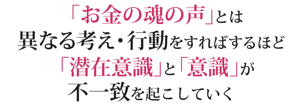 つまり、「お金の魂の声(本当の自分の才能)」に気づかなければ、顕在意識と潜在意識の不一致が自覚できない領域で起こり続けてしまいます。