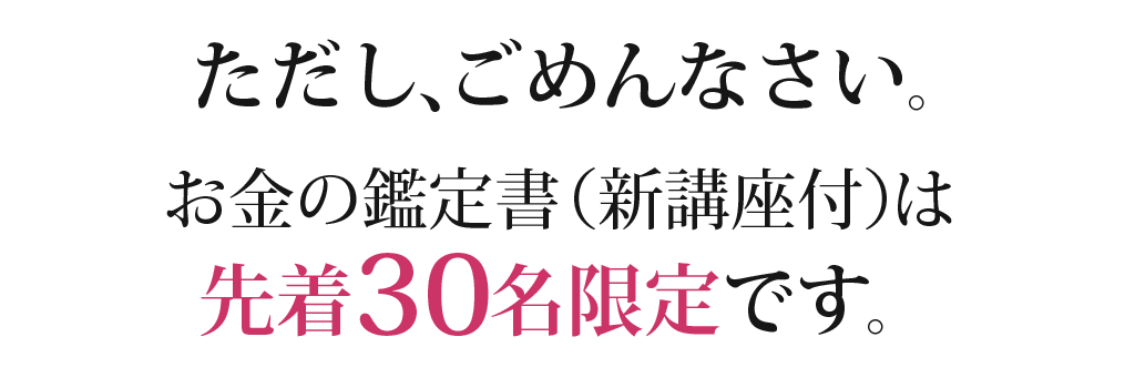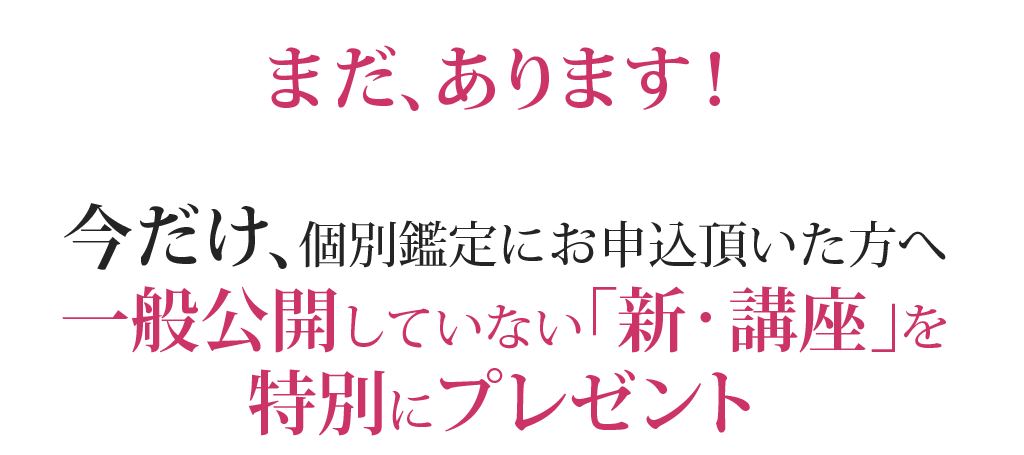 今回3年ぶりに解禁となった「お金の鑑定」そこで、お申込された方には、一般公開していない「新・講座」を特別に無料プレゼントさせていただきます。